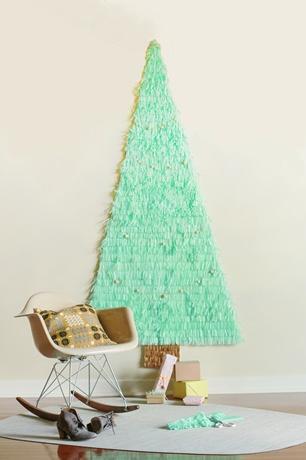 Se perto do sofá, da mesa de centro, do rack ou da mesa lateral não cabe nadica de nada, que tal explorar uma parede vazia? Sim, a ideia é essa mesmo: montar uma Árvore de Natal na parede. Esta Árvore aqui debaixo é bem alta, mas você pode reaproveitar a ideia e adaptá-la para fazer do tamanho que você quiser. Basta usar uma base de isopor, recortá-la em formato triangular e, com papel crepom, fazer várias franjinhas e ir colando – elas serão as folhas da árvore. Depois é só enfeitar com alguns detalhes, recortes e até tinta dourada para deixá-la pronta pra colocar na parede! O passo a passo está aqui, em inglês, com fotos autoexplicativas.