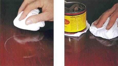 Funciona assim: você coloca um pano levemente umidecido em cima da mancha, espera o ferro esquentar e depois passa ele morno por cima do pano, quantas vezes for necessário para a mancha sair. Depois basta dar uma polida generosa na superfície recuperada para o móvel ficar novinho em folha.