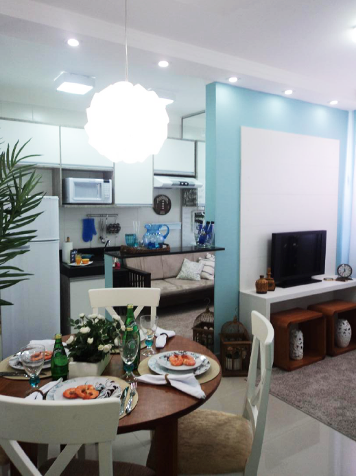 Achei muito bonito e bem distribuido dentro do padrão MRV em torno de 47 mt2. A harmonia acredito estar entre o piso, parede e iluminação Aproveito para pedir a dica de onde encontrar papel de parede, luminarias tipo ” de lata”, cortina.