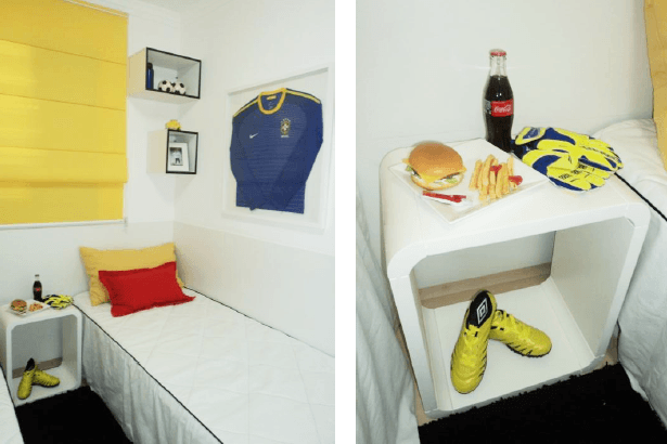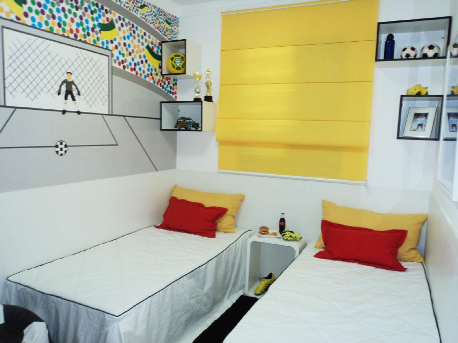 E olha só a dica para as mamães: veja só quantas soluções lúdicas e criativas que a arquiteta encontrou para deixar o quartinho dos meninos cheio de personalidade! Na parede, a escolha do adesivo fez toda a diferença e o Módulo Sintonia na cor branca substitui a mesa de cabeceira de forma moderna e criativa. Sensacional!