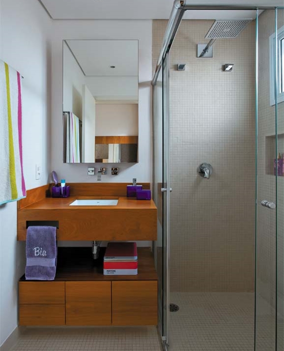 Banheiros muito pequenos também têm salvação. Coloque uma bancada reduzida e posicione a torneira na lateral caso for necessário, para que você ganhe mais espaço para organizar seus pertences. Aposte em um ambiente monocromático com cores claras, trabalhando o colorido apenas nos detalhes. Além de dar um ar de limpeza, esta solução vai fazer seu espaço parecer mais amplo e iluminado.
