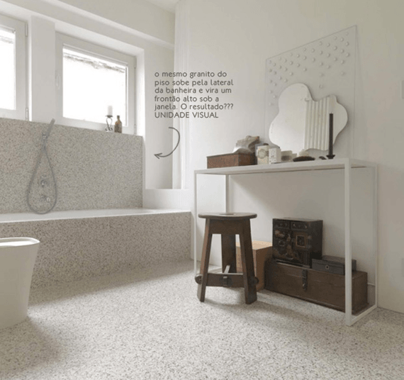 Bonito demais o piso de granito que só acaba na janela da banheira. Muito agradável aos olhos e a beleza de se morar bem. smile