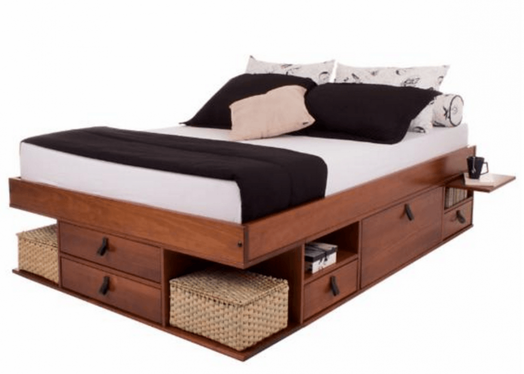 Links dos produtos: 1 – Cama de Casal Bali; 2 – Estante de Parede Legno Grande; 3 – Puff Sapateira Kinder;  4 –Estante com Caixas Organizadoras Tools; 5 – Arara Módulo.